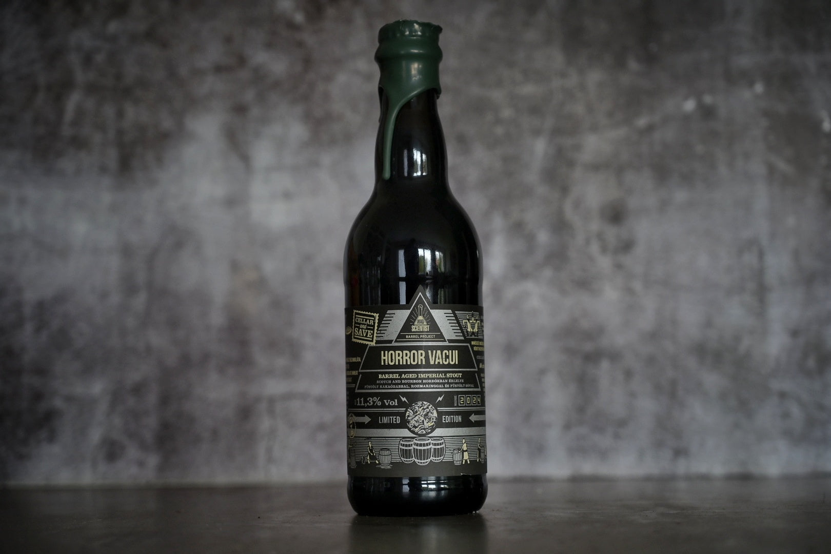 11.3% Imperial Stout , Scotch and Bourbon barrel aged with smoked cocoa, rosemary and smoked salt